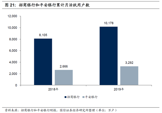 从金融科技发展较快的招商银行和平安银行来看,手机银行 App累计用户数和月活跃用户数均实现了较快增长:(1)从注册用户数来看,截止2019年末,招商银行两大App累计用户数(未去重)达2.05亿户,平安口袋银行App为 0.89亿户,同比分别增长38.4%和43.7%。(2)从月活跃用户来看,2019年招商银行两大App的MAU(未去重)达10178万户,平安口袋银行为3292万户,同比分别增长25.6%和23.5%。招商银行和平安银行月活用户率分别为49.6%和36.8%。