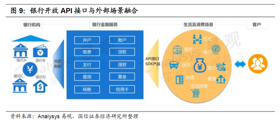 (2)互联网企业在人才、信息技术等方面优势突出,生活场景丰富,直接将场景引入到手机银行App上以及向第三方平台输出银行金融服务,有助于银行节省成本和时间。同时,银行通过开放部分API接口,可以和合作伙伴共享数据,开发更具个性化的场景。考虑到投入产出效益、银行技术人才不足等弊端,银行不可能也没必要自建所有的场景,即使互联网企业也没有一个App涵盖所有的生活场景。因此,我们认为银行在自建核心场景的同时,通过API接口等方式引入成熟的第三方生活平台,不仅能快速完善生态圈,银行App也不用承担过多平台研发投入和运维的压力。另外,像医疗、出行等专业化程度要求较高的场景,银行当前自建也有难度。除了引进来策略,银行还可以走出去,将金融服务嵌入到优质合作伙伴平台上,抢占更多的场景市场。