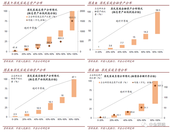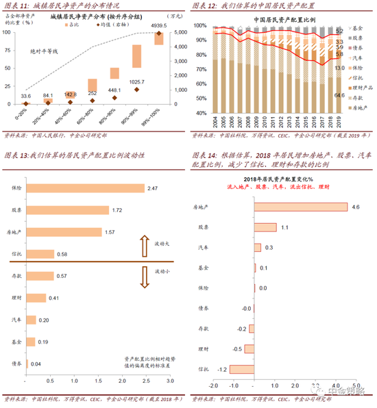调查报告显示样本城镇居民家庭总资产平均为317.9万元,中位数为163.0万元。平均资产大幅高于中位数表明资产分布较为不均。我们认为中位数可能更具代表性。我们对各类资产自上而下汇总估算的中国城乡户均资产规模大约在118万元,考虑到我们的估算包括农村家庭,这个均值可能具有更广的参考意义。