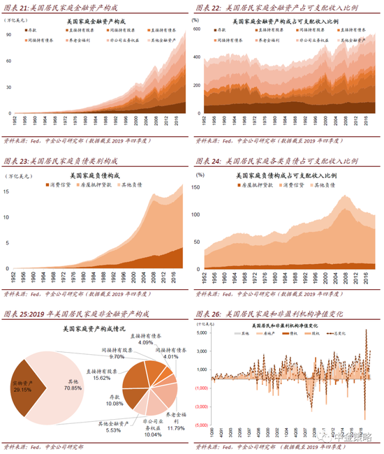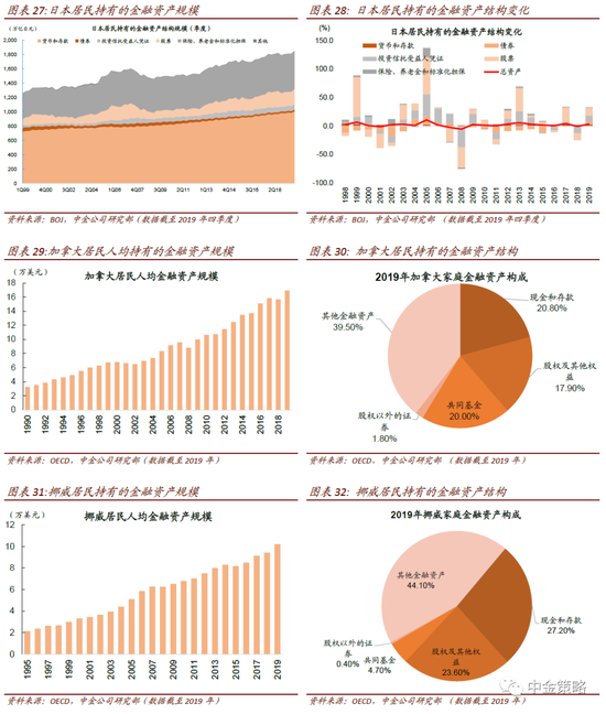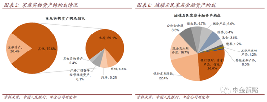 调查结果显示,受调查家庭中99.7%的家庭拥有金融资产,户均金融资产64.9万元,占家庭总资产的20.4%。央行报告也指出,与美国相比中国城镇居民家庭金融资产占总资产的比重偏低,比美国低22.1的百分点。我们自上而下估算的城乡户均金融资产38.3万元,考虑到这包括农村家庭,这一估算在数量级及体量上可能也是大致合理的。