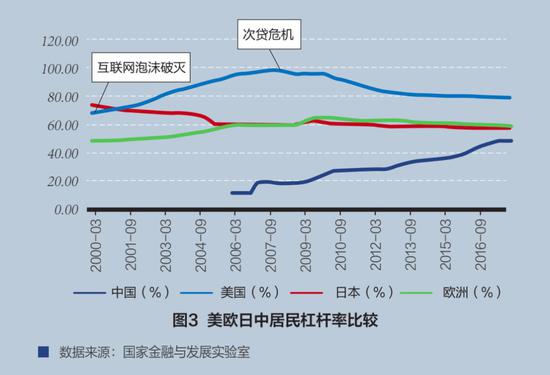 就居民而言,居民杠杆率保持平稳是现代发达经济体的基本特征之一。美国在本世纪初,提供了一个反面例子。在当时互联网泡沫破灭的时候,美国政府为了刺激经济,遂放松标准,大力向不具备还款能力的居民推行“次级贷款”,致使居民杠杆率急剧上升,进一步引发了2007年的次贷危机(见图3)。居民债务是同脆弱的房地产市场联系在一起的。一旦市价下落,造成住房的重置价格与住房承载的债务接近,以至于出现负资产,就会有危险。