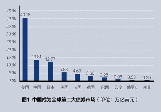 中国也是这场债务浪潮的主角之一。世界银行的报告显示,本轮的债务浪潮中,新兴经济体的债务积累有相当一部分来自于中国。体现在债券市场中,中国已超过日本,成为全球第二大债券市场(见图1)。截至2019年6月末,中国的债券市场余额已达到13.81万亿美元,甚至比法国、德国、巴西、印度、俄罗斯和南非六国的债券余额之和(12.35万亿)还多。不过,相对于美国高达40万亿美元的债券余额而言,中国的债券市场规模仍相对较小。