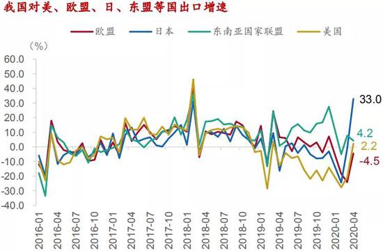 分地区来看,我国对美国、欧盟、日本的出口增速均有明显提升。其中,对美、日出口由负转正,分别为2.2%(+23pct)和33%(+34.4pct);对欧盟出口为-4.5%,较前值提升19.7pct。此外,我国对东盟国家的出口有所回落,4月同比增速为4.2%,较前值下降3.5pct。