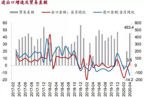 4月我国进出口贸易顺差453.4亿美元,较去年同期(+130.2亿美元)增加2.5倍。