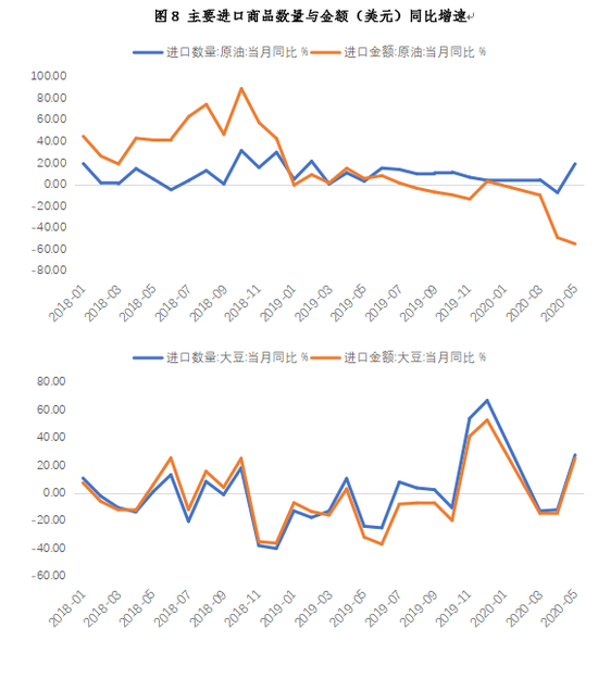 不过我们也注意到,在内需渐进改善,尤其是建筑链条景气回升背景下,5月钢材、铜材、成品油等商品进口增速加快。同时,尽管5月我国自美进口额受疫情导致贸易环境不佳影响,同比下降13.5%(前值-11.1%),但当月我国大豆进口量和进口额增速大幅转正,显示我国正在积极兑现中美第一阶段贸易协议承诺。