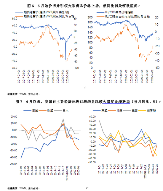 5月进口额同比下降16.7%,降幅较上月扩大2.5个百分点,低于普遍预期。这一方面仍体现价格因素影响——尽管4月原油价格回升带动国际大宗商品价格整体上扬,当月RJ-CRB商品价格指数均值同比下跌30.2%,跌幅较上月收敛5.7个百分点,但运输时滞使得5月进口数据仍在一定程度上反映前期大宗商品价格暴跌的影响。这在原油进口方面体现的比较明显。另一方面,海外疫情防控导致各国生产活动放缓,或从供给端制约了国内进口增长,可以看到,4月以来,我国自美欧日等发达经济体,以及东盟、巴西、俄罗斯、印度等主要新兴经济体进口额均呈现较大幅度负增。此外,5月我国对铁矿石、煤炭等商品进口量和进口额增速大幅下滑,前者主要受海外矿区疫情升级导致供给受限影响,后者则与国内煤炭进口政策收紧,进口额度不足有关。