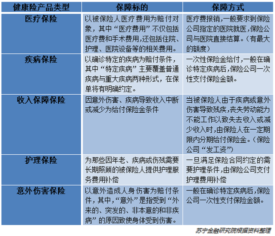 在此需要说明,我们常见的健康险其实仅包括医疗保险、疾病保险、收入保障保险和护理保险四种产品类型。严格意义上,意外伤害险不属于健康险的范畴,但意外险与健康险互为补充,为我们的家庭提供全方位的保护,故在此一并讨论。