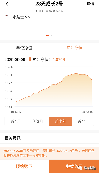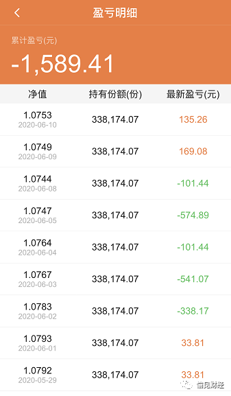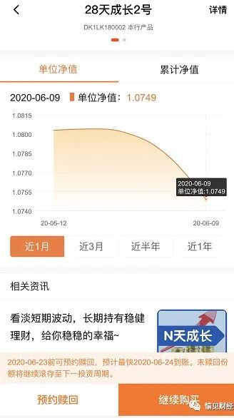 比如这款。6月1日,某股份行本行理财,“28天成长2号”单位净值几天内从1.0792跌到了1.0753,小40万元的理财,仅月初这几天的功夫,就累计亏损了近1600元。