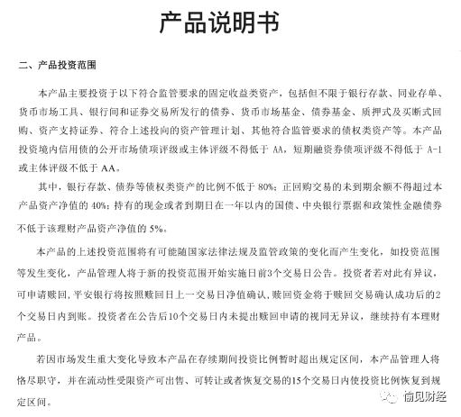 啥是“稳健”的固定收益型理财呀,就是资产配比里债券市场占大头。呐,比如这一款净值接连下跌的理财产品,其产品投资范围显示,银行存款、债券等债权类资产的比例不低于80%。