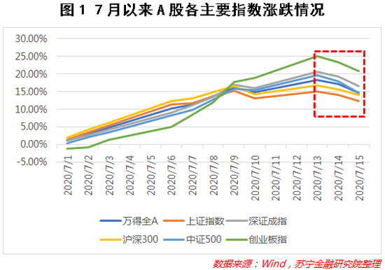 7月以来,A股各主要指数放量快速上涨后,近两个交易日有所调整(见图1),高涨的市场情绪开始摇摆:这是股市的正常调整(意味着上车),还是牛市结束的前奏(意味着下车)?