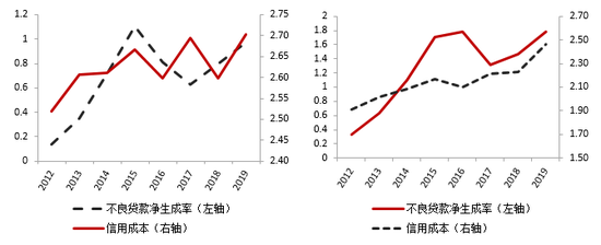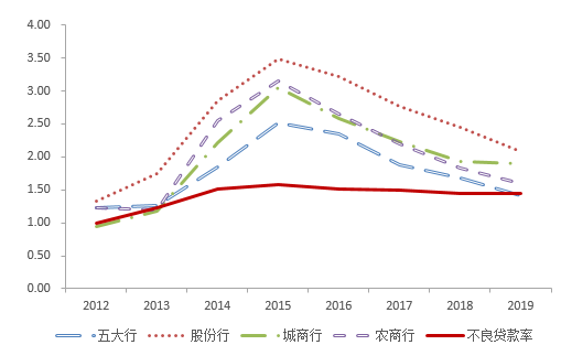 此外,近年来股份行贷款信用成本上升速度有所加快,2019年已达到2.5%,同样创下近十年新高,其上升“斜率”与五大行相比更加陡峭,说明股份行也在为不良形成速度加快做准备,且与五大行相比力度更大,这也反映出股份行与五大行相比面临更大的资产质量管理压力(图6、图7)。