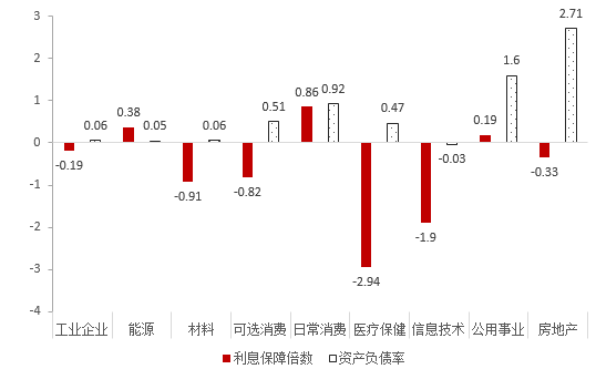 图9:2019年比2018年各行业利息保障倍数及资产负债率变化(倍,%)