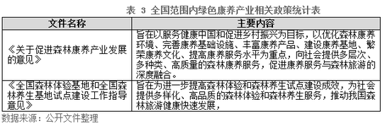 党的十九大以来,国家对康养产业绿色化的重视程度不断提高,先后颁布《关于促进森林康养产业发展的意见》、《全国森林体验基地和全国森林养生基地试点建设工作指导意见》等指引性文件,逐步开始设立产业发展规范性要求,引导市场建立更为完善的绿色康养产业体系。2019年,国家林业和草原局、民政部、国家卫生健康委员会、国家中医药管理局联合印发《关于促进森林康养产业发展的意见》,明确指出到2022年,将建设300处国家森林康养基地,并于2035年实现1200处森林康养建设,向社会提供多层次、多种类、高质量的森林康养服务,满足人民群众日益增长的美好生活需要。[3]