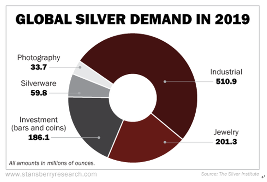 据白银研究所(Silver Institute)统计,2019年白银总需求量约为9.92亿盎司,其中大约51%的总需求来自工业应用(包括太阳能电池的制造)。