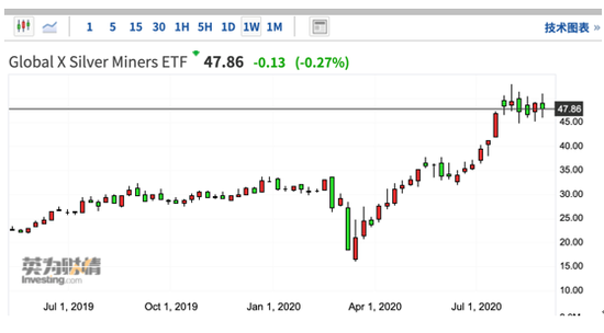 The Global X Silver Miners Fund (SIL) 是一篮子约30家白银矿商组成的基金,该基金自3月中旬以来上涨了约165%。