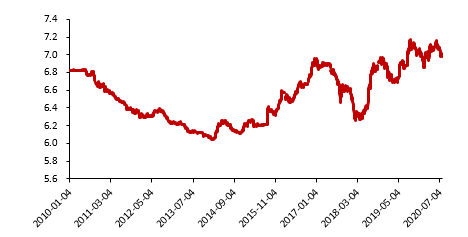 理论上,当一国的储蓄大于投资时,出口大于进口。因此,储蓄的变化能够直接影响到经常账户,进而对汇率产生影响。多年来,高储蓄带来的经常项目顺差一致是人民币汇率升值的基础。但随着我国储蓄增速的下降,其对于人民币汇率将带来相反的影响。当前中美贸易摩擦对我国出口带来了较大影响,在面临外部需求降低的情况下,储蓄增速的下降使经常项目顺差降低,汇率面临贬值的压力。截至2020年第一季度,我国经常项目逆差336.96亿美元,为近十年来第二次出现逆差。人民币汇率近年来也出现了贬值态势,截至2020年8月10日,人民币兑美元汇率为6.9701,与2014年年初的高点相比贬值了13.19%(图9)。受经济增速下滑、人口老龄化等因素的影响,未来我国居民储蓄增速或将持续下降,这将对人民币汇率带来一定的贬值压力。