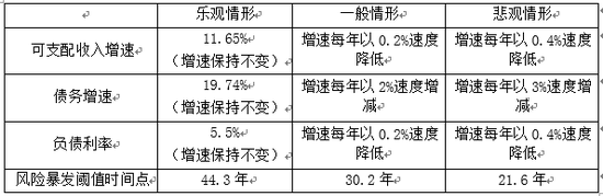其中,n代表居民部门可支配收入能够偿还债务利息的最长年限。根据测算,在乐观情况下(居民可支配收入不再下滑,居民债务增速不再上升),44.3年后居民部门的可支配收入将无法偿还债务利息;一般情形下(居民可支配收入稳定下滑,居民债务增速稳定上升),30.2年后居民部门的可支配收入将无法偿还债务利息;悲观情形下(居民可支配收入加速下滑,居民债务增速加速上升),21.6年后居民部门的可支配收入将无法偿还债务利息(表1)。可以看出我国居民部门面临的偿债压力较大,若储蓄增速继续下行,未来居民部门债务风险将不断上行。