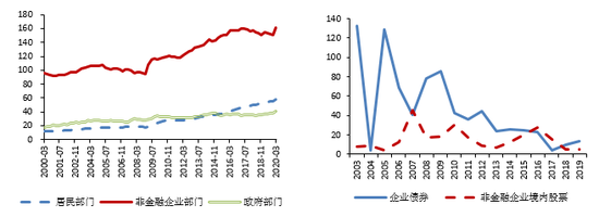 近年来,随着我国经济增速的放缓,实际利率的不断降低,居民的储蓄行为发生了变化,主要特征表现为降低储蓄存款数量,持有更高资本回报的金融标的,例如房地产、银行理财、股票、基金、债券等。从居民持有的房产数量来看,截至2019年末,我国户均拥有住房1.5套,住房拥有率达到96%,高于2017年的70%,表明居民依然在增加房产持有数量。从银行理财产品规模的变化来看,我国居民储蓄存款有较大部分用于购买理财产品。数据显示,2018-2019年,由于资管新规的影响,大量的理财产品回归商业银行资产负债表内,且被大量提前赎回,造成居民存款的快速上升(图6),充分表明居民部门购买了大量理财产品。居民部门对于高回报金融资产持有量的增加使得居民部门的债务情况与金融资产价格之间的关系更为紧密。