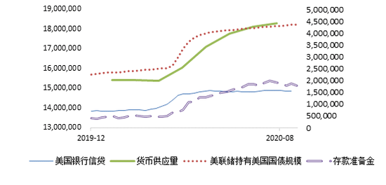危机当中金融机构普遍存在风险偏好下降的问题,为此,美联储购买国债为政府提供资金来源,政府增大财政支出推高货币供应量,弥补金融机构风险偏好下降带来的资金缺口。2008年下半年开始,金融危机持续发酵,雷曼兄弟、贝尔斯登等大型金融机构倒闭,引发了金融机构破产潮。为缓解市场恐慌情绪,2008年10月,美国国会通过了7000亿美元救市方案,财政支出增大快速推高了商业银行的存款准备金和货币供应量。随后美联储启动QE政策,持有国债规模开始上升,在银行信贷规模下降的情况下,货币供应量依然保持了较大规模的扩张(图7)。此次危机中,特朗普签署了2.2万亿美元的经济刺激计划,美联储持有国债、存款准备金、货币供应量(M2)等主要金融指标同步上升,但美国商业银行贷款规模增幅相对较慢,说明货币供应量的扩张有较大部分来自财政支出的贡献,财政支出的扩大弥补了银行信贷下行造成的社会资金需求缺口(图8)。