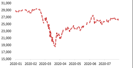 对比两次危机可以发现,金融危机时期美联储并未直接购买企业债,导致企业债券日均交易规模迅速下降,但在流动性预期修复后,企业债券交易逐步回暖。从国债交易情况看,由于美联储的资产购买计划分批实施,2018年下半年国债交易量快速上升,市场情绪基本稳定,交易较为活跃(图10)。此次危机中,美联储同时买入国债和企业债,二者日均交易量迅速走高。但在大幅购买操作后,国债和企业债的日均交易量又出现极速下降,2020年8月,二者日均交易量已低于疫情前水平(图11)。考虑到美联储持有的国债规模占国债总规模已上升至16%左右,这意味着有16%的美国国债无法完全进行交易,同时美联储资产端的CPFF、PMCCF、SMCCF等工具已经开始持续下降,但市场交易情绪并不活跃,说明此次危机中大规模资产购买确实在一定程度上影响了市场的交易情绪和价格发现功能。