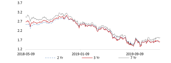 图14:美国2年、3年、7年期国债收益率变化情况(%)