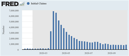 本周四10月15日公布的最新数据显示,截至10月3日当周,美国共计有89.8万人首次申请常规失业补助金,相比于前一周的84.5万有所回升。这也是连续7周以来,美国周度初请失业金的人数一直在80-90万的区间。本次危机爆发之前,该数据一直在每周20万左右。