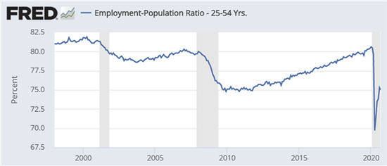 (就业占人口比例(25-54岁),数据来源:美联储经济数据库FRED)