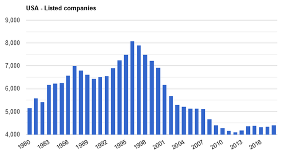 从1996年开始,愿意上市的美国公司越来越少,到2012年仅有4102家上市公司,相比1996年差不多减少了一半,比1975年也减少了14%。即使近几年美股迎来史上最长牛市,世界银行统计的2018年最新数据显示,美国只有4397家上市公司,数量分别比1975年和1996年减少了8%和45%。