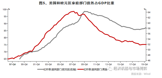 内部方面,西方私人部门持续的去杠杆,导致消费和投资低迷。目前有较大共识是,2007年金融危机的一个根源就是私人部门杠杆上升过高。金融危机后,美欧私人进行了较坚决的去杠杆行动(图5)。去杠杆化的一个结果就是