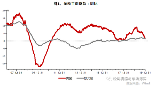 尽管央行在放水方面使出了“洪荒之力”,但作为政策传导中介的银行发放贷款、创造货币的增速远低于基础货币增速,也低于促进经济扩张的“目标水平”。2010年至今,美国和欧元区工商企业贷款年均增速分别仅为5.6%和-0.7%(图1),远低于15%和13%的基础货币年均增速。