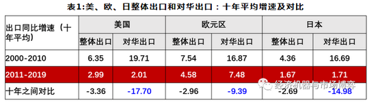 中国方面,全社会对“四万亿”进行了彻底的否定,将主要精力放到供给侧改革上,几乎放弃了总需求管理政策。其结果是名义GDP增速从2010年的20%的水平,降至疫情前的8%以内。2010年之后,中国已经取代美国,成为全球经济增长的第一动力。第一动力在过去十年出现如此巨大的“(主动)刹车”,其对世界的冲击显著超过美国内部去杠杆的力度。以2000年之后两个十年出口对比,美、欧、日在过去十年对华出口平均增速,较2000-2010年间平均增速分别下降17.7%、9.4%和15%,这个降幅远超同期整体出口降幅(表1)。特别强调的是,对于大国来讲,经济政策永远都是首先为国内实际负责。我们没有义务为了拉动世界经济而进行强刺激。四万亿强刺激之后,我们战略收缩整体是没有问题的,但其对外部的影响也是客观存在的,这也是一种大国的“烦恼”。