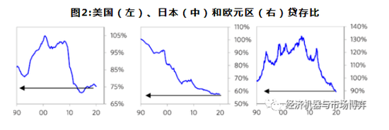 一是危机惨痛记忆太深,导致银行在过去十年主动选择去杠杆。2008年金融危机是百年一遇的金融危机,期间西方银行业几乎是“全军覆没”。雷曼、贝尔斯登、美林等金融巨头陷入破产或者被并购的命运。花旗、大摩等银行跌幅超过90%。与美国银行相比,欧洲的银行经历2008年金融危机和2010年欧债危机双重打击,至今大部分仍处于“垂死挣扎”的状态。无论是危机期间的惨痛记忆,还是糟糕的实际境遇,都决定了银行在贷款方面保持谨慎,进行主动去杠杆。从商业银行贷存比来看,美国、日本和欧元区在过去十年都出现了明显下降,显示商业银行的信贷收缩非常明显(图2)。