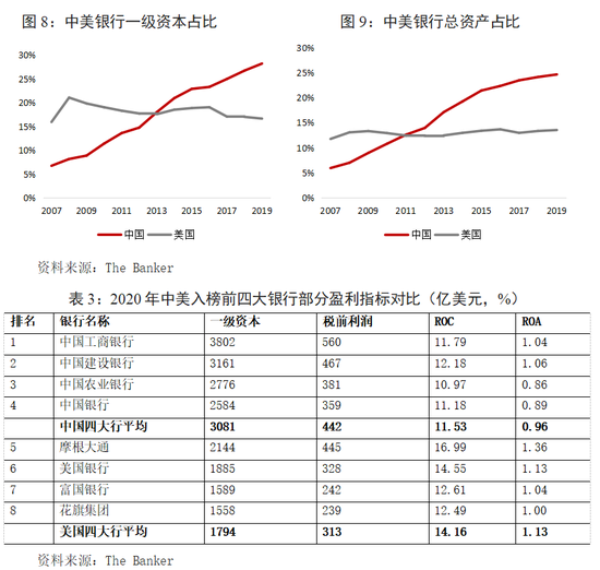 二是相比美国银行业,中国银行业经营效率仍有差距。虽然中国银行业按一级资本或总资产均占据全球银行业的1/4以上规模,但银行业整体经营效率与美国银行业相比仍有一定的差距。2010-2020年,美国入榜银行税前利润总额的复合年增长率为23.74%,而中国则为13.24%。2020年榜单中,中资银行占全球银行业资产总额的25%,占全球税前利润的28%;而美国银行资产仅占14%,但利润却占22%。美国入榜银行平均ROA、ROC水平分别为1.31%和12.77%,均明显优于中国入榜银行(0.71%和9.40%)。对比中国前四大银行和美国前四大银行,前者平均一级资本接近后者的两倍,但税前利润规模几乎相当(表3)。其中,摩根大通2019年全年实现了445亿美元的税前利润,已超过一级资本排名靠前的中国农业银行和中国银行。其ROC和ROA水平十分可观,分别为16.99%和1.36%,为前20大银行中最高水平。