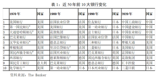 三是全球银行业竞争日益激烈,半世纪历经四次大洗牌。近50年全球经济实力格局已发生从西方向东方的扭转,银行业实力的变化紧跟其后。全球前10大银行排名经历了翻天覆地的变化,先后经历了美国、法国、日本、中国银行业主导的局面。1970年,美国银行业紧跟本国企业海外扩张态势迅速增长,全球按资产排名的前10家银行中美国银行占据7家(表1);1980年,法国银行业掀起私有化浪潮,前10大银行中有4家为法国银行,法国农业信贷银行以1050亿美元的资产规模位居第一位;1990年,全球经济增长动能向亚洲倾斜,日本银行业登上历史舞台,前10大银行有6家日本银行;2000年经济全球化成为国际大趋势,大型银行的地域分布相对平均,前10大银行分别有3家美国银行,4家日本银行,2家欧洲银行和1家中国银行;2010年,欧美大型银行金融脱实向虚态势明显,规模扩张速度加快,前10大银行中有4家美国银行,5家欧洲银行和1家中国银行;2020年,危机后欧美银行业大幅缩水,中国银行业登上历史舞台,前10大银行以中国(4家)、美国(4家)为主。