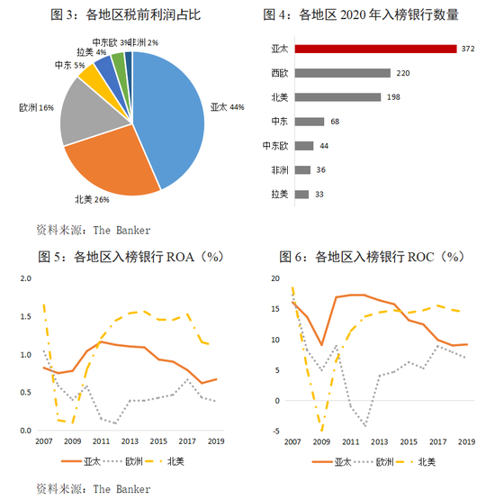 一是规模上亚太领先,欧洲收缩,北美稳定。2007-2020年,北美银行业在1000大银行的税前利润份额一直保持27%左右,但亚太和欧洲地区发生扭转,前者份额由20%增至44%,后者份额由43%降至21%(图3)。目前无论从入榜银行数量、资产规模、一级资本和税前利润总额方面,亚太地区都在全球范围内位列各地区首位。亚太入榜银行数量由2007年的176家上升至2020年的372家(图4);一级资本占比由15%上升至48%;资产规模占比由13%提升至46%;税前利润占比由19%提升至44%。欧洲银行业则由此前第一大银行业市场持续收缩,自金融危机以来长期遭受低增长和低利率的困扰。10年前欧洲银行业几乎贡献了全球银行业利润的1/3,到2020年这一比例下降至16%。北美地区银行业的规模相对较小,但一直保持平稳,一级资本和总资产规模占1000家银行的20%左右。