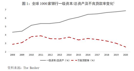 二是监管逐步趋严,驱使银行经营由规模扩张向审慎平稳转变。全球银行业最早的扩张和发展主要基于母国经济发展和企业海外扩张的金融需求,监管环境的放松也为银行业扩张提供了更为便利的条件。例如,1980年美国废除关于最高利率上限的“Q条款”,放松银行海外经营要求,美国银行业资产规模特别是海外资产快速增长。随着经济和金融全球化发展,区域化和全球化的金融风险频频爆发,特别是2008年全球金融危机后,美国制定多德弗兰克法案,欧洲建立一体化监管框架,巴塞尔协议III出台,标志着新的监管时代到来。同时,地缘政治冲突和逆全球化态势下合规监管要求突出,反欺诈、反洗钱等监管要求、KYC(了解客户原则)要求更加细化,给银行增加了更大的经营成本,同时也驱使全球银行业向更加审慎平稳的方向发展。2020年1000家银行的一级资本总额达到8.8万亿美元,同比增长6.08%,近10年增长了79.64%,平均年增速为7.9%。一级资本/资产比重达到历史最高水平6.87%,且在过去十年中稳步增长。平均不良贷款率降至2.56%。其中前50家银行的不良贷款率降至1.69%(图1)。