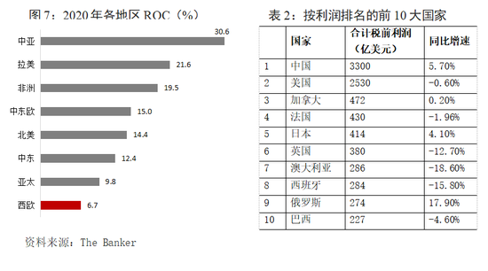 三是发展最艰难的是西欧银行业,大型银行亏损额逐步扩大。欧洲银行业经过十余年的收缩,其体量仍位居全球第二大,但近年来欧洲银行业兼并重组活动加大,不少大型银行盈利下滑、亏损现象频出。2020年1000家银行中,德国、英国与法国上榜银行税前利润分别同比下降19.4%、12.7%和1.96%(表2)。2020年西欧地区入榜银行的平均ROC为6.7%,位列各地区末位(图7)。从2019年欧洲大型银行业绩来看,欧洲各地区大型银行都遭遇盈利下滑的冲击:汇丰利润同比下降33%,法国兴业银行下降17%,德意志银行由盈利转向亏损,且亏损幅度位列全球首位;桑坦德银行利润下降 13.66%,BBVA银行下降25.95%。2020年上榜前10大银行的欧洲银行只有汇丰控股,德意志银行下跌5位至第32位,法国兴业银行下跌3位至第31位。