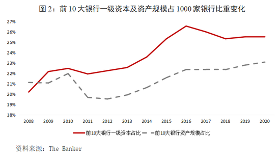 三是全球银行业集中度不断提高。近年来全球前10大银行的平均资产规模和一级资本规模增速明显超过其他同业,近10年累计增幅分别达103%和41%,而同期1000家银行平均增幅分别为79%和34%。2020年最新榜单的前10大银行的资产规模和一级资本分别合计2.2万亿美元和29.6万亿美元,在1000家银行中分别占23.1%和25.5%,较2010年分别增加了3.4和3.6个百分点(图2)。前10大银行盈利水平明显优于同业,税前利润合计323.1亿美元,占1000家银行的27.9%,明显高于资产占比和一级资本占比。同时,全球大型银行的区域分布集中度逐步提升。2020年前50大银行共分布在13个国家,较10年前减少了4个国家;如果将范围收缩到前25大银行,分布国家数量由9个减少至6个。在全球长期低利率、经济增长低迷的环境下,银行经营的规模化、多元化优势将进一步凸显,在风险管理和科技应用持续提升的基础上大规模、多元化的超级大型银行将在全球金融体系中发挥更大作用。