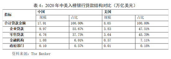 三是相比于美国,中国银行业贷款结构相对集中,企业贷款占比较高。作为全球第一大和第二大银行业市场,新冠肺炎疫情下的银行信贷风险敞口备受关注。中美入榜银行的合计贷款余额分别在17.91万亿美元和8.05万亿美元(表4),位列各国之首。从贷款结构来看,中国银行业的企业贷款占比相对较高,为55.67%,规模在10万亿美元左右;而美国银行业的企业贷款占比相对较低,为46.51%,规模在3.83万亿美元。一般而言,企业贷款相比于零售的不良贷款率较高,更容易出现针对单一客户的大额风险;同时,相对集中的贷款结构给风险管理带来了更大的挑战。相对于美国银行业,中国银行业的企业贷款规模和占比都相对较高,贷款结构相对集中,疫情下将面临更加严峻的风险管理挑战。