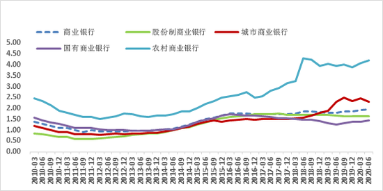 从负债规模来看,大型商业银行和中小商业银行负债规模近年来呈现增长态势。虽然自2017年以来,金融去杠杆力度的加大以及对同业业务的监管趋严,中小银行负债来源受到一定限制,但负债规模的增速仍然高于大型商业银行(图1)。