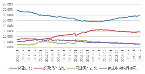 自2017年以来,资管新规、流动性新规以及大额风险暴露管理办法等多方面多层次监管政策出台,市场乱象逐步清理,中小银行面临外部监管和内部业务结构调整的双重压力。一时间,压降投资资产比重、压缩同业业务以及业务回归本源等多方面调整需求成为中小商业银行业务调整的导向。2017年以来,中小银行资产端投资资产比重显著下降,非标转标、表外回表的作用下信贷资产比重逐步上升,银行业务回归本源成为主基调,资产端流动性在逐步改善(图12)。