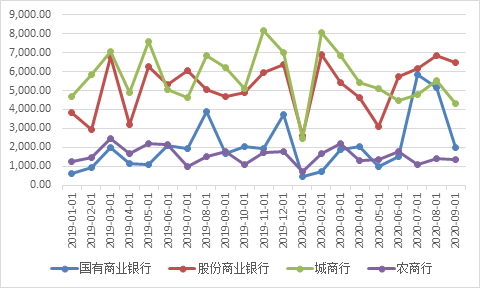 从同业存单发行统计来看,近年来股份制商业银行和城商行构成同业存单的最重要的发行主体,同业存单是其重要的融资渠道之一(图7)。从发行利率水平来看,城商行和农商行发行利率普遍高于国有商业银行和股份商业银行。受公司治理、业务发展能力、业务规模、风险控制水平、市场认可度等多方面的限制,城商行和农商行通过同业存单融资的成本高于国有商业银行和股份商业银行,股份商业银行同业存单融资成本与国有商业银行趋近(图8)。2020年以来,同业存单发行利率与疫情发生形成了明显的相关关系。同业存单发行利率受市场资金充裕以及资金需求下滑的叠加效应在4-5月形成较为明显的低点,后随复工复产相关政策出台以及商业银行加大信贷投放力度之后快速回升(图8)。2020年下半年,同业存单发行规模和利率呈现双双反弹走高的局面,需关注市场利率上行对于中小商业银行负债融资成本和主动负债意愿带来的负面影响。
