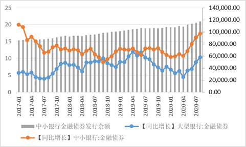 从金融债券发行来看,中小银行金融债券发行在2020年明显加快,2020年下半年金融债券发行余额增速超过15%,显示商业银行力图摆脱区域存款营销的限制通过公开市场吸收长期资金、利用宽松市场提升杠杆的意愿明显增强(图9)。