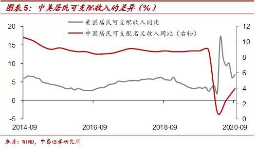 2、中美通胀却出现明显背离。但如果我们看一下中美两国终端消费品的通胀,差异却很大。新冠病毒对美国的影响时间要更长,程度也更大,但美国的核心通胀从6月份以后就开始企稳反弹,而我国的核心通胀水平却不断向下,当前已经降到了有数据以来的最低位。通胀差异的背后,可能和居民收入差异有关系。尽管美国受到新冠疫情冲击,但今年以来美国居民的可支配收入增速是大幅抬升的,而我国居民可支配收入增速大幅下降。