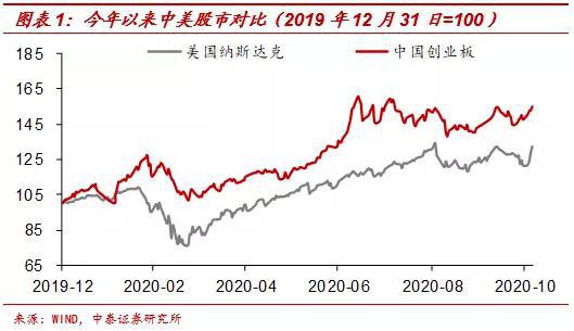尽管受到新冠疫情的影响,中美经济受到的冲击都很大,但在宽松货币的大背景下,今年两国资产价格的表现都非常亮眼。以股市为例,尽管在疫情爆发初期都经历了大跌,但今年美国纳斯达克指数相比去年底上涨了33%,中国的创业板指数上涨了55%。