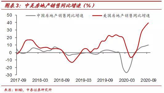 和股市类似,价格上涨时成交量上升,价格下跌时成交量萎缩,这是典型的资产量价特征,对于房地产市场也是适用的。在新冠冲击的初期,两国的房地产交易都有明显下滑,但很快又快速攀升,当前中美房地产销售面积增速都达到了过去几年的高点水平。
