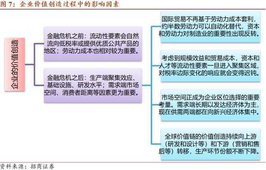 金融危机之前,低劳动力成本、低税率、以及提供优质公共产品的地区对企业具有较高的吸引力。但金融危机之后,生产端的聚集效应、基础设施、研发水平;以及需求端的消费者距离等因素变得越来越重要,价值创造持续向上游环节(研发和设计等)和下游环节(营销和售后等)转移,生产过程创造的价值份额持续下降(麦肯锡,2019)。