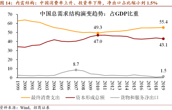 2. 内需与外需的关系:扩大内需是指内需占比仍然不够,外需影响仍然显著。应注意外需的重要性并不能以净出口占GDP比重(2019年为1.5%)来衡量,而应该用进出口总额占GDP比重来衡量(2019年出口占比18.6%,进口占比17.1%,进出口总额占比35.8%),原因是进口、出口都是中国经济系统不可或缺的部分。
