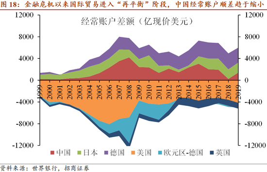 4.1. 金融危机以来,国际贸易进入“再平衡”阶段。展望未来,全球正处于百年未有之大变局,中美关系出现本质变化,中国的外资外贸将受到明显影响;同时随着人均可支配收入的提升和居民消费的升级,中国的进、出口将更趋平衡。综合之下,中国的经常账户顺差将趋于收窄。