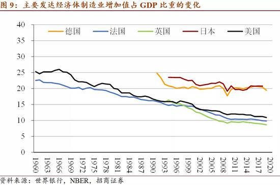 从国际经验来看,主要发达经济体中日本、德国在过去20年中实现了制造业比重基本稳定,目前占比都在20%左右;而美、英、法,以及欧元区、OECD制造业比重都趋于下降。根据NBER数据,美国制造业占比已经从1960s的25%左右下降至当前的11%左右。但金融危机之后下降速度有所放缓。主要新兴经济体之中,韩国的经验值得借鉴,目前制造业占比仍在25%以上,而巴西的教训要避免,制造业占比已降至10%以下。